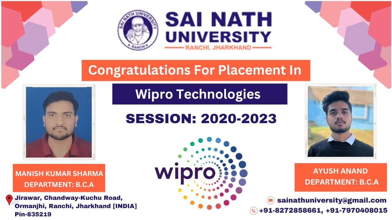 Wipro Technologies में साई नाथ विश्वविद्यालय के छात्रों का प्लेसमेंट हुआ है । यह Article साईं नाथ विश्वविद्यालय के छात्रों द्वारा उपलब्धि हासिल करने और उनके करियर की Growth को दर्शाता है।